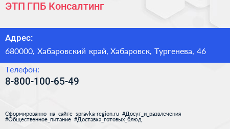 ЭТП ГПБ Консалтинг по адресу 680000, Хабаровский край, Хабаровск, Тургенева, 46 в дальнейшем Организация, размещена в следующих категориях: