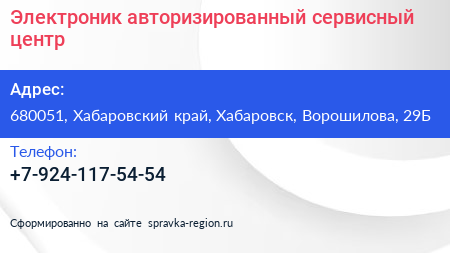 Электроник, авторизированный сервисный центр по адресу 680051, Хабаровский край, Хабаровск, Ворошилова, 29Б в дальнейшем Организация, размещена в следующих категориях: