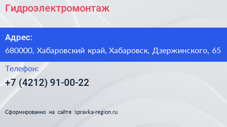 Гидроэлектромонтаж по адресу 680000, Хабаровский край, Хабаровск, Дзержинского, 65 в дальнейшем Организация, размещена в следующих категориях: