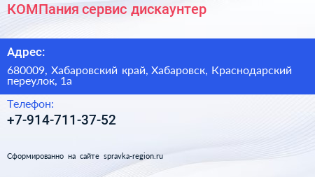 КОМПания, сервис-дискаунтер по адресу 680009, Хабаровский край, Хабаровск, Краснодарский переулок, 1а в дальнейшем Организация, размещена в следующих категориях: