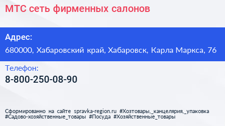 МТС, сеть фирменных салонов по адресу 680000, Хабаровский край, Хабаровск, Карла Маркса, 76 в дальнейшем Организация, размещена в следующих категориях: