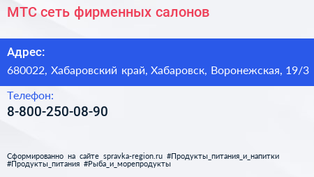 МТС, сеть фирменных салонов по адресу 680022, Хабаровский край, Хабаровск, Воронежская, 19/3 в дальнейшем Организация, размещена в следующих категориях: