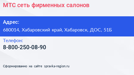 МТС, сеть фирменных салонов по адресу 680014, Хабаровский край, Хабаровск, ДОС, 51Б в дальнейшем Организация, размещена в следующих категориях: