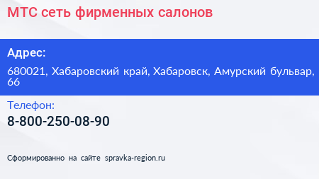 МТС, сеть фирменных салонов по адресу 680021, Хабаровский край, Хабаровск, Амурский бульвар, 66 в дальнейшем Организация, размещена в следующих категориях: