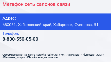 Мегафон, сеть салонов связи по адресу 680051, Хабаровский край, Хабаровск, Суворова, 51 в дальнейшем Организация, размещена в следующих категориях: