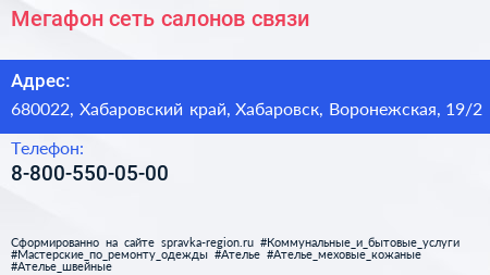 Мегафон, сеть салонов связи по адресу 680022, Хабаровский край, Хабаровск, Воронежская, 19/2 в дальнейшем Организация, размещена в следующих категориях: