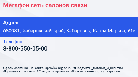 Мегафон, сеть салонов связи по адресу 680031, Хабаровский край, Хабаровск, Карла Маркса, 91в в дальнейшем Организация, размещена в следующих категориях: