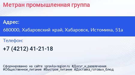 Метран, промышленная группа по адресу 680000, Хабаровский край, Хабаровск, Истомина, 51а в дальнейшем Организация, размещена в следующих категориях: