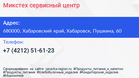 Микстех, сервисный центр по адресу 680000, Хабаровский край, Хабаровск, Пушкина, 60 в дальнейшем Организация, размещена в следующих категориях: