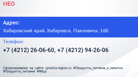 НЕО по адресу Хабаровский край, Хабаровск, Павловича, 16Б в дальнейшем Организация, размещена в следующих категориях: