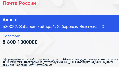 Почта России по адресу 680022, Хабаровский край, Хабаровск, Вяземская, 3 в дальнейшем Организация, размещена в следующих категориях: