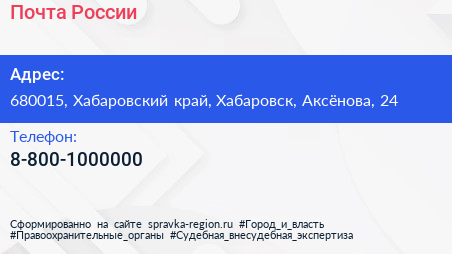 Почта России по адресу 680015, Хабаровский край, Хабаровск, Аксёнова, 24 в дальнейшем Организация, размещена в следующих категориях: