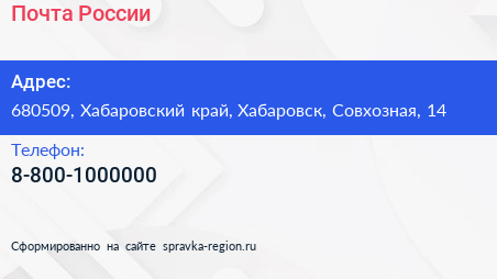 Почта России по адресу 680509, Хабаровский край, Хабаровск, Совхозная, 14 в дальнейшем Организация, размещена в следующих категориях: