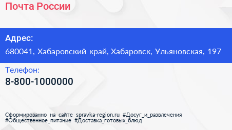 Почта России по адресу 680041, Хабаровский край, Хабаровск, Ульяновская, 197 в дальнейшем Организация, размещена в следующих категориях: