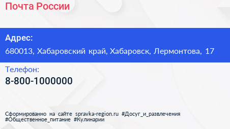 Почта России по адресу 680013, Хабаровский край, Хабаровск, Лермонтова, 17 в дальнейшем Организация, размещена в следующих категориях: