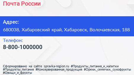 Почта России по адресу 680038, Хабаровский край, Хабаровск, Волочаевская, 188 в дальнейшем Организация, размещена в следующих категориях: