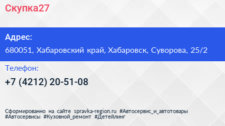 Скупка27 по адресу 680051, Хабаровский край, Хабаровск, Суворова, 25/2 в дальнейшем Организация, размещена в следующих категориях: