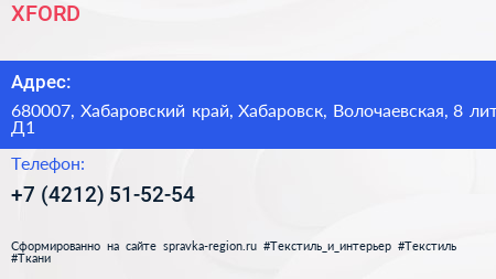 XFORD по адресу 680007, Хабаровский край, Хабаровск, Волочаевская, 8 лит Д1 в дальнейшем Организация, размещена в следующих категориях: