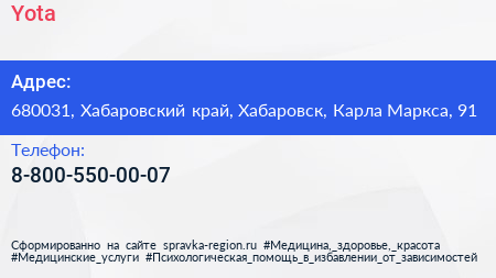 Yota по адресу 680031, Хабаровский край, Хабаровск, Карла Маркса, 91 в дальнейшем Организация, размещена в следующих категориях: