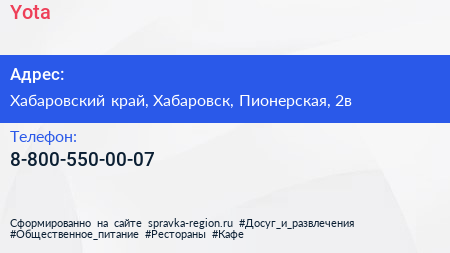 Yota по адресу Хабаровский край, Хабаровск, Пионерская, 2в в дальнейшем Организация, размещена в следующих категориях: