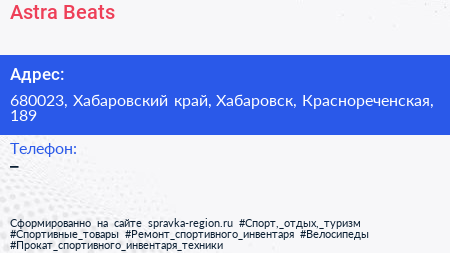 Astra Beats по адресу 680023, Хабаровский край, Хабаровск, Краснореченская, 189 в дальнейшем Организация, размещена в следующих категориях: