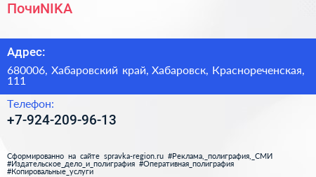 ПочиNIKA по адресу 680006, Хабаровский край, Хабаровск, Краснореченская, 111 в дальнейшем Организация, размещена в следующих категориях: