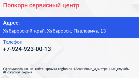 Попкорн, сервисный центр по адресу Хабаровский край, Хабаровск, Павловича, 13 в дальнейшем Организация, размещена в следующих категориях: