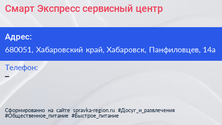 Смарт Экспресс, сервисный центр по адресу 680051, Хабаровский край, Хабаровск, Панфиловцев, 14а в дальнейшем Организация, размещена в следующих категориях: