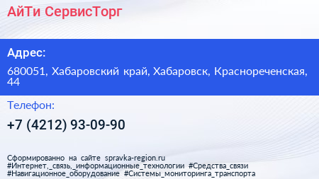 АйТи-СервисТорг по адресу 680051, Хабаровский край, Хабаровск, Краснореченская, 44 в дальнейшем Организация, размещена в следующих категориях: