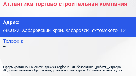 Атлантика, торгово-строительная компания по адресу 680022, Хабаровский край, Хабаровск, Ухтомского, 12 в дальнейшем Организация, размещена в следующих категориях: