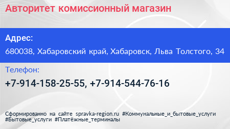 Авторитет, комиссионный магазин по адресу 680038, Хабаровский край, Хабаровск, Льва Толстого, 34 в дальнейшем Организация, размещена в следующих категориях: