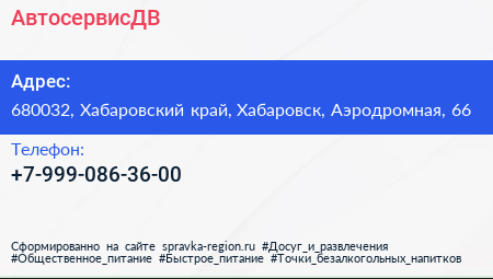 АвтосервисДВ по адресу 680032, Хабаровский край, Хабаровск, Аэродромная, 66 в дальнейшем Организация, размещена в следующих категориях: