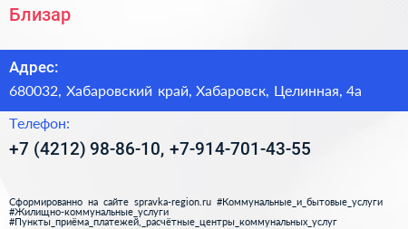 Близар по адресу 680032, Хабаровский край, Хабаровск, Целинная, 4а в дальнейшем Организация, размещена в следующих категориях: