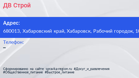 ДВ Строй по адресу 680013, Хабаровский край, Хабаровск, Рабочий городок, 10 в дальнейшем Организация, размещена в следующих категориях: