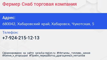 Фермер Снаб, торговая компания по адресу 680042, Хабаровский край, Хабаровск, Чукотская, 5 в дальнейшем Организация, размещена в следующих категориях: