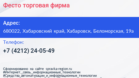 Фесто, торговая фирма по адресу 680022, Хабаровский край, Хабаровск, Беломорская, 19а в дальнейшем Организация, размещена в следующих категориях: