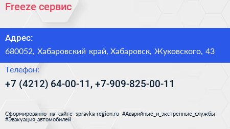 Freeze-сервис по адресу 680052, Хабаровский край, Хабаровск, Жуковского, 43 в дальнейшем Организация, размещена в следующих категориях: