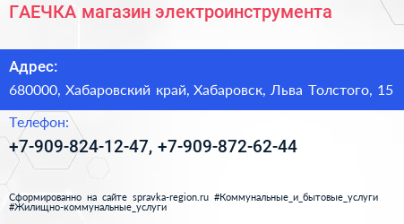 ГАЕЧКА, магазин электроинструмента по адресу 680000, Хабаровский край, Хабаровск, Льва Толстого, 15 в дальнейшем Организация, размещена в следующих категориях: