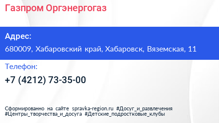 Газпром Оргэнергогаз по адресу 680009, Хабаровский край, Хабаровск, Вяземская, 11 в дальнейшем Организация, размещена в следующих категориях: