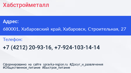 Хабстройметалл по адресу 680001, Хабаровский край, Хабаровск, Строительная, 27 в дальнейшем Организация, размещена в следующих категориях: