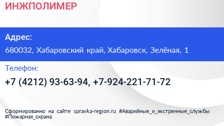 ИНЖПОЛИМЕР по адресу 680032, Хабаровский край, Хабаровск, Зелёная, 1 в дальнейшем Организация, размещена в следующих категориях: