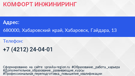 КОМФОРТ ИНЖИНИРИНГ по адресу 680000, Хабаровский край, Хабаровск, Гайдара, 13 в дальнейшем Организация, размещена в следующих категориях: