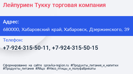 Лейпуриен Тукку, торговая компания по адресу 680000, Хабаровский край, Хабаровск, Дзержинского, 39 в дальнейшем Организация, размещена в следующих категориях:
