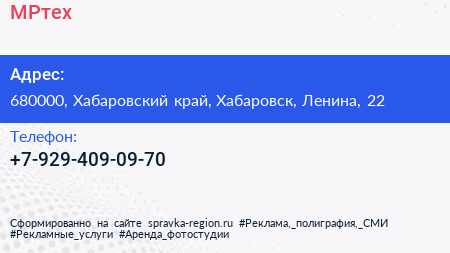 МРтех+ по адресу 680000, Хабаровский край, Хабаровск, Ленина, 22 в дальнейшем Организация, размещена в следующих категориях: