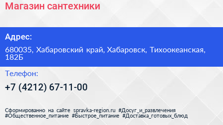 Магазин сантехники по адресу 680035, Хабаровский край, Хабаровск, Тихоокеанская, 182Б в дальнейшем Организация, размещена в следующих категориях: