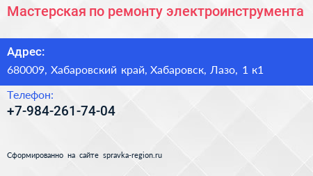 Мастерская по ремонту электроинструмента по адресу 680009, Хабаровский край, Хабаровск, Лазо, 1 к1 в дальнейшем Организация, размещена в следующих категориях: