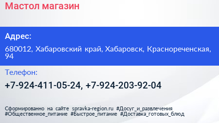 Мастол, магазин по адресу 680012, Хабаровский край, Хабаровск, Краснореченская, 94 в дальнейшем Организация, размещена в следующих категориях: