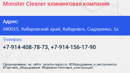 Monster Cleaner, клининговая компания по адресу 680015, Хабаровский край, Хабаровск, Сидоренко, 1а в дальнейшем Организация, размещена в следующих категориях: