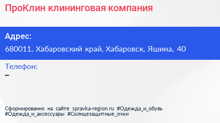 ПроКлин, клининговая компания по адресу 680011, Хабаровский край, Хабаровск, Яшина, 40 в дальнейшем Организация, размещена в следующих категориях: