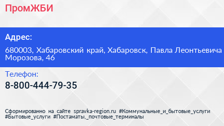 ПромЖБИ по адресу 680003, Хабаровский край, Хабаровск, Павла Леонтьевича Морозова, 46 в дальнейшем Организация, размещена в следующих категориях: